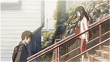 Une jeune femme aux cheveux longs et sombres descend un escalier extérieur aux rampes rouges, tandis qu'un jeune homme en costume sombre monte les mêmes marches. Ils se croisent en évitant le regard de l'autre, dans un décor urbain japonais baigné par une lumière matinale éclatante.